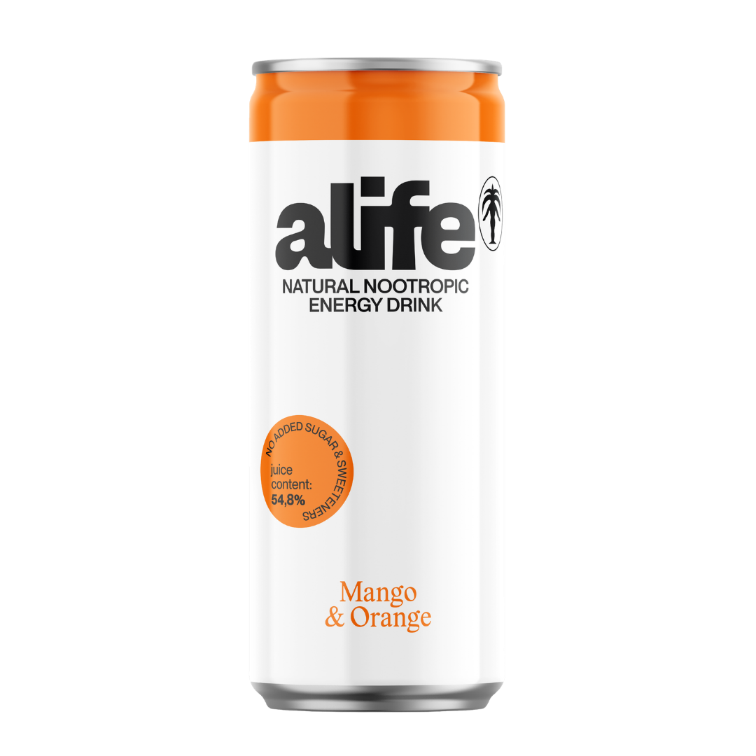 Each alife can contains 30 mg / 100 ml of natural caffeine from guarana extract. This ensures a smooth, longer-lasting energy boost without sudden spikes or crashes. As much as 59.5% of the drink is made from concentrated fruit juices, allowing the mango and orange blend to deliver a rich, natural, and refreshing taste.